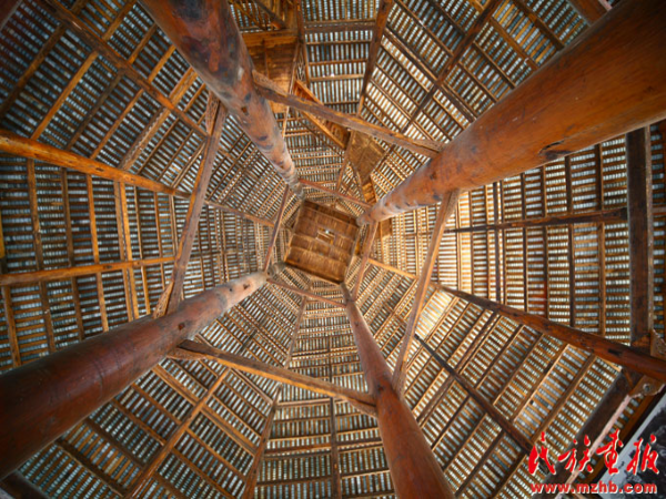 鼓楼四周墙体采用栅栏形式,栅栏内部通常有12根大柱子构成第二层柱网序列,鼓楼内部通常有4根主柱,支撑着鼓楼主要结构及屋顶的重量,4根主柱建立了固定的、中性空间领域。这种构成法使得鼓楼内部空间与外部空间保持着视觉的连续性,使得鼓楼与村寨在空间上产生融合性和内聚力,鼓楼的中心是火塘。
