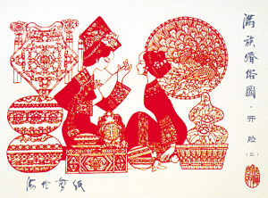 满族婚俗剪纸《开脸》。均为资料图片