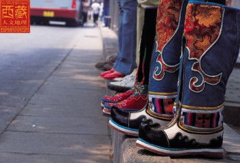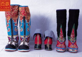 西藏高原地域辽阔,每个地区都有属于自己的鞋子。藏族男女鞋,外观虽然很像舞台上古装戏里穿的靴子,但用牛皮做底,底高二寸,腰高至小腿之上,鞋面用红绿相间的毛呢装饰,鞋腰也有线条、花纹,鞋帮用各色丝线或各色皮革、氆氇、金丝缎制成。人们能从一个人所穿的鞋子判断出一个人的职业和社会阶层。