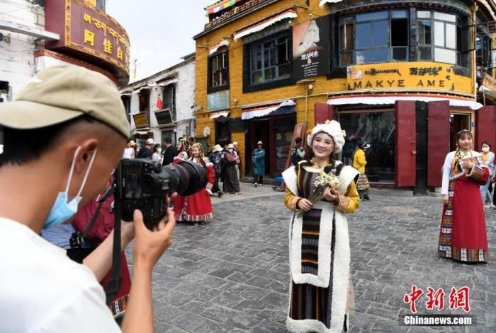 图为7月24日,游客穿上藏族传统服饰在拉萨市八廓街拍照留念。 中新社记者 贡嘎来松 摄