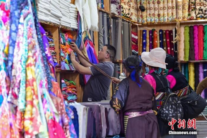 拉萨老城区的八廓街上,花样繁多的藏装店构成一道绚烂民族风。店中选购藏装的顾客,既有本地人,也不乏口音各异的外地游客。22日下午,在此经营藏装店10余年的卓玛迎来“特殊”的客人。