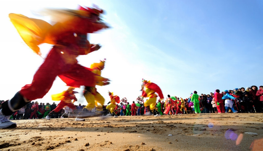秧歌是春节群众欢庆活动中,起着承前启后、烘托气氛的大型歌舞形式。这里所指的“秧歌”不仅是单一的“秧歌舞”,而是包含着数十种歌舞形式所组合的文艺演出队伍。这支队伍既要在走街串巷中做行进表演,又将最后集中于广场做正式的歌舞演出。因此在北方,人们索性就把过去有着祭祀色彩,而今完全成为春节娱乐式的民间文艺形式称为“社火”或“秧歌”,把这支浩荡的队伍统称为“秧歌队”。秧歌队最前方,在高举象征来年风调雨顺大伞的艺人率领下,“龙舞”“狮舞”舞队位列队首;接下来是一组手挥彩绸翩翩起舞,走“双葫芦”“绕菠花”各种图案的“大场”表演队;然后是腰间横挎红色腰鼓、踏着激越鼓声的“腰鼓队”,表演着令人眼花缭乱的“回头望月”等套路;再后面是腰系竹马或旱船,扮演新郎送媳妇回娘家的“跑驴”或“跑旱船”;接着是脚踩丈八高跷、穿戏装、彩绘脸谱的“高跷队”。接下来还有名为《火盆架子》的队伍,那是把冬季用于取暖的炭盆架,用绳子将其高于脚面悬挂在肩上。盆架以绸布、花草装饰,表演者戏装打扮,表演一段段脍炙人口的戏曲节目。他们被欢天喜地、熙熙攘攘的人们拥簇着一同前往最后进行表演的广场。由各个村镇陆续举行的这种热烈而欢腾的歌舞庆祝形式,将贯穿在整个春节期间,直到正月十五“灯节”。