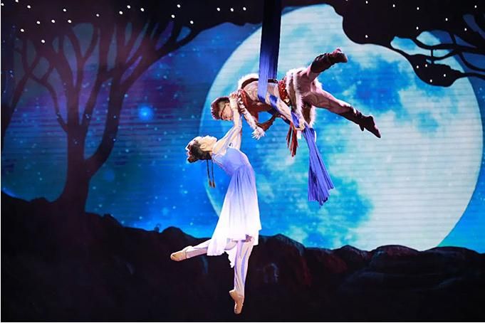 杂技艺术在剧场空间维度的呈现,一是把身体作为一种最为本质的符号材料进行直接表现;二是通过与物体、音乐、舞蹈、灯光、唱诗等的排列组合,展示技艺的身体与物体、空间的关系,达到彰显其生命意蕴与美学品质的目的。剧中网吊、绸吊、转动杆上技巧等项目非常炫技,展现了现代杂技的审美意境,诗与思在舞台上相得益彰。绸吊极具浪漫色彩,承载着轮回与终极的生命哲理;智者的“唱诗”,凸显了该剧的史诗特征,增加地域文化和远古历史的厚重感。