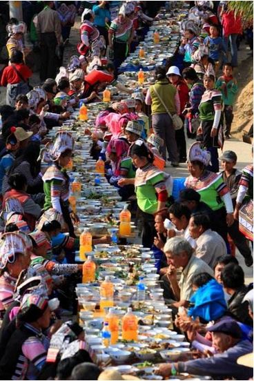 节日期间,哈尼寨子摆起长街宴,哈尼语叫“姿八多”,意为“互相轮流着敬酒”。小寨子摆一次,吃一天,大寨子则要摆两三次,吃两三天。每户做一桌酒菜,抬到寨子街道上摆好,一户接一户沿着街道摆成长街宴,八个或十个人自愿结合为一桌畅饮。大寨子分片轮流做东,负责长街宴的酒菜,其他片的人做食客,从早吃到晚,场面十分热闹。