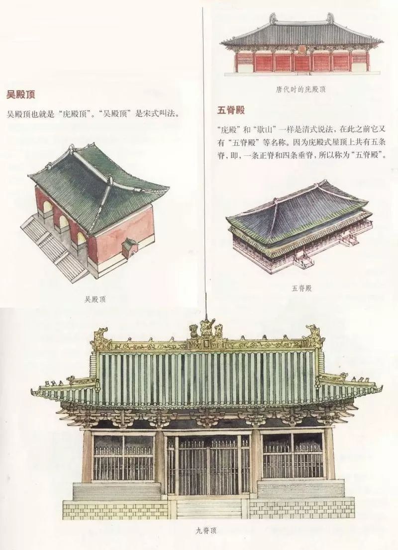 其中庑殿顶最早,约出现于先秦时期。在商代的甲骨文、周代铜器、汉画像石与明器、北朝石窟中都有反映。据《周礼·考工记》载:“商人四阿重屋”,即早在商朝,已有四阿屋顶,但只是四坡水的茅草房而已。