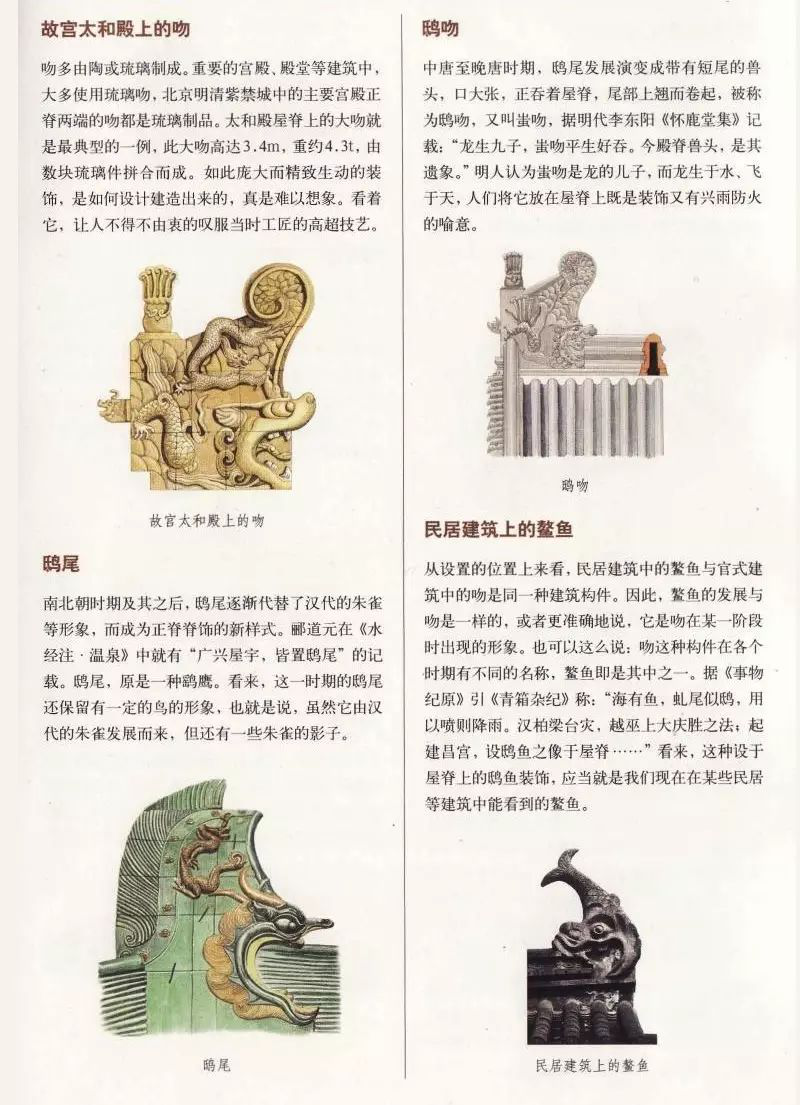 4. 正脊装饰:在我国古代的很多建筑中,特别是一些等级较高的建筑中,其屋顶正脊上往往设有各色装饰。除了常见的正脊两端的吻合正脊中心的宝顶外,在正脊的前后两个立面上,还会雕饰或塑有花、草或龙等。