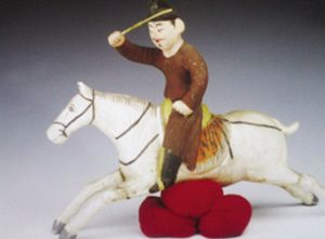 与扬州出土的打马球铜镜上的图案相比,1972年,新疆考古工作者在吐鲁番阿斯塔那187号墓发现的一尊打马球俑,更具立体感。该泥俑高37厘米,蓄八字短须,身着圆领紧身绛色窄袖长袍,头戴幞头,脚穿黑色皮靴,足踩马蹬,骑一匹白色大马飞奔,手臂挥杖,作打马球状。