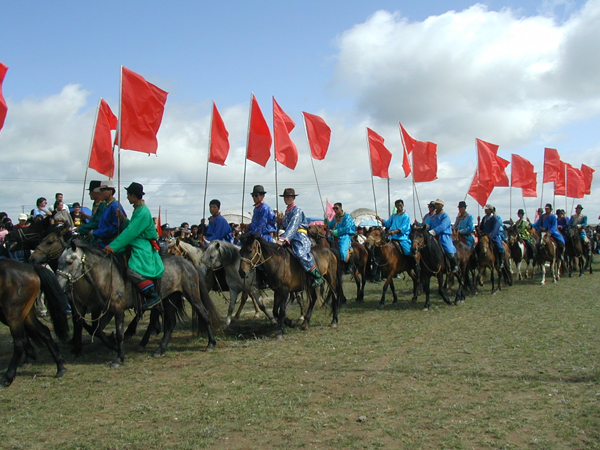 蒙古民族几乎人人都天生酷爱马,也很会训练马,若在过去,作为马背民族更是离不开马。好马、好骑手一直享有极高的荣誉。因此,赛马当然成为牧民最喜爱的运动。蒙古族赛马一般分赛走马和赛奔马两种。赛走马是指让鞍具齐全并钉有合适马掌的马跑对侧步(即前后蹄一顺交错前进),比马的速度、耐力、稳健和美观。有丰富经验者才能骑出走马来,所以,参赛的马多用5岁以上的成年马,骑手也以成年人为主。比赛时,要求骑手有高超的骑术,能够驾驭好马,使其既走得快、稳、美,又不能跑起来。还要求马抬步越高越好,这样显得很有“风度”,这不仅取决于马掌的重量,还要看马的素质。一匹好的走马,即便在牧区也价格非常昂贵。赛奔马是比马的速度和耐力,以先到达终点者为胜。奔马的步伐与走马不同,是四蹄分前后成双交错奔跑。参赛的选手多为十二三岁的小男孩,因为他们体轻敏捷。为了减轻马的负荷和照顾骑手的安全,奔马都不备鞍具或配备轻巧的鞍具。骑手们只穿华丽的彩衣,头束红绿飘带,显得英武、神气。赛程一般长25至35千米。奔马赛比走马赛普遍,参赛的人数也多,少则几十,多则逾百。比赛开始,选手们迅速跃马,扬鞭飞奔,观众则雀跃欢呼,呐喊助威【图为马队进场仪式,刘军摄影】。