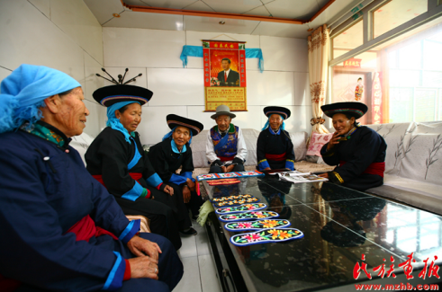 东沟村大庄村老年协会的土族老人们在交流刺绣技艺 引自民族画报