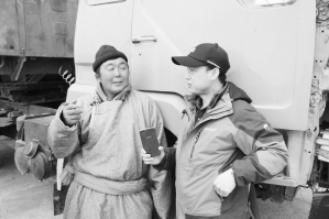 2017年,王玉龙(右)在内蒙古二连浩特采访蒙古国卡车司机。 受访者供图