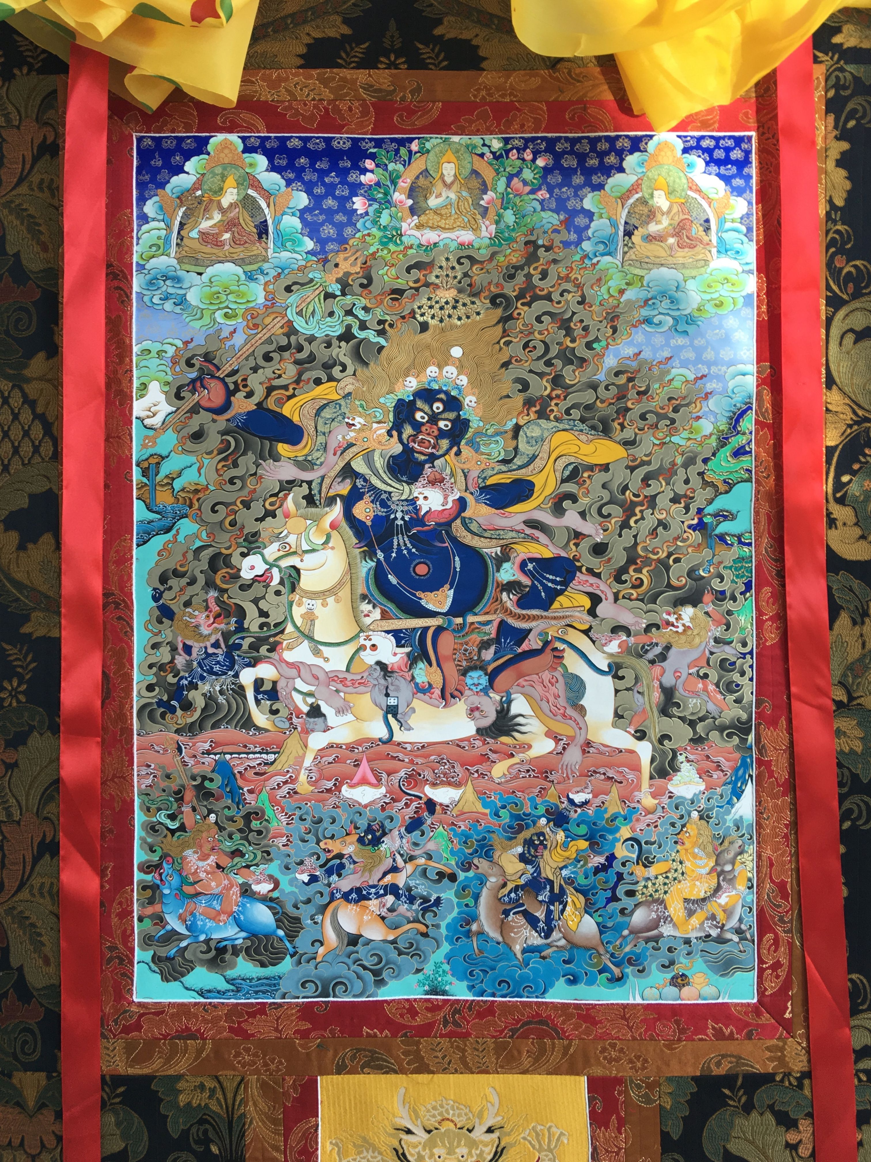 吉祥天母又称吉祥天女,梵文 Lakşmī,音译“拉娔诗米”,藏语称“班达拉姆”,是藏密中一个重要女性护法神。她是古印度神话中的人物,传说是天神和仇敌阿修罗搅动乳海时诞生的。后来婆罗门教和印度教把她塑造成女神,为她取名“功德天女”(又称吉祥天女),说她是毗湿奴的妃子,财神毗沙门之妹,主司命运和财富。后来她成了佛教的重要护法神。