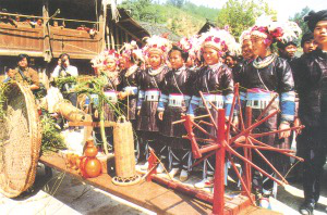 寨里建有两座鼓楼,相距20米,有人称之为龙凤鼓楼。鼓楼前大坪子里,青壮年芦笙队和少年芦笙队在同时表演。男女老少身着盛装唱着山歌,小伙子们跳起粗犷豪放的芦笙舞,迎接远方来的客人。侗乡的好客确实名不虚传。在百里侗乡,吹奏芦笙不仅仅是娱乐,还是隆重场合中的礼仪乐舞,凡祭祖祭神、迎接贵宾都要以芦笙开场。
