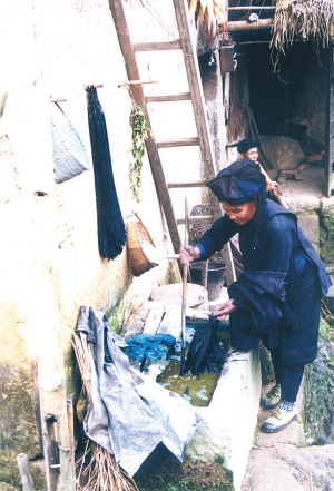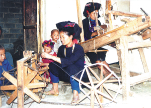 纺纱、织布、蓝染,是哈尼族妇女制作服装的重要组成部分。她们在织布前要做的准备工作,就是操动制线机,把一根根短小的线连接起来,捲在小木棍上,然后操动绞线机,把线棍上的线分开绞在木梭子和木轮子上。接着是分线,人数不限,但不能少于5人,一般10米为一组线。织布时,在织布机上方搭起两排密集的线网,当双脚踩动踏板时,两排线网一上一下地交叉移动,将拖着线的梭子一次次地左右穿梭于线网中。这样重复地进行,就织出一筒筒布,一般10米为一筒布。最后把织成的布放入靛缸里泡洗,晒干后就可以制作服装了。