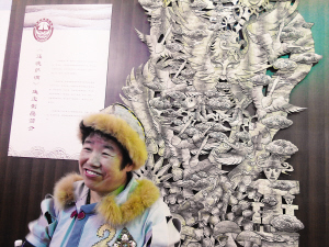 在展厅里,几位来自黑龙江的手工艺人还现场展示了鱼皮制作技艺。64岁的刘升从事鱼皮制作已近20年,被评为黑龙江省工艺美术大师。她告诉记者,赫哲族过去主要用鱼皮制作衣服,现在则用鱼皮制作各种工艺品、小挂饰。在她身后,挂着一张长两米多、宽约1.5米的鱼皮画《还魂萨满》,展示了赫哲族神话传说中的图景,有萨满、有森林、大鸟和各种图腾,充满了原始而神秘的气息。刘升说,这还只是未完成的作品,但已用了3000多张大马哈鱼皮。