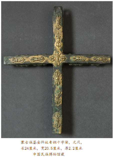 眼前此件在内蒙古达茂旗出土的元代鎏金青铜十字架,四面排列有浮雕金刚杵纹,其正面每个金刚杵图案上均有鎏金装饰,十字架上部穿孔则可用于悬挂。金刚杵是藏传佛教里的修行法器,象征力量与智慧;而十字架则是基督教文化的标志,如此混搭,历史便要传递出种种:在信仰藏传佛教的蒙古高原,金刚杵,象征无畏圆满,十字架,则代表救赎重生,东西方文化的结合亦呈现某种文明可能达到的无可比拟之高度。