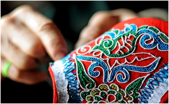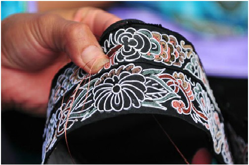 第四步是刺绣,包括三个环节,即固定框架图案、填芯和镶边。固定框架图案,即用一根大针将马尾线穿好,再用另一根稍小的针穿上同色丝线,然后一边用马尾线在布面上镶成各种图案,一边用穿有丝线的小针将图案固定在布面上。填芯,即用各色丝线将固定好的图案空隙部分填满。镶边,即用橙色和黑绿色丝线在四周挑绣成镶边图案。