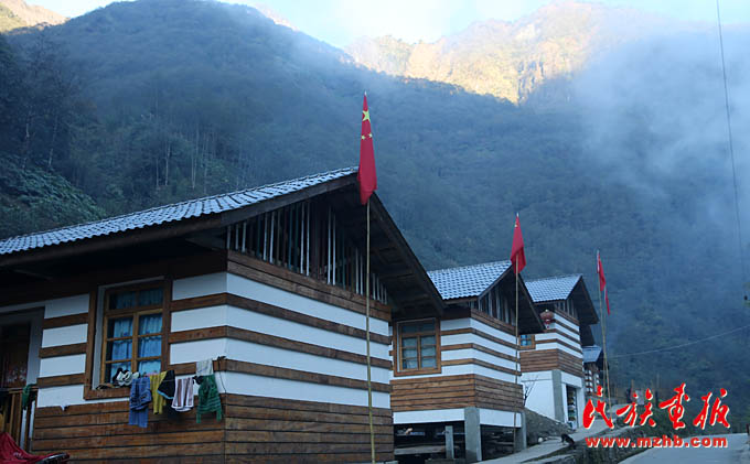 国家大力支持发展独龙族社会事业,真正为独龙族百姓谋福利。独龙族居民房屋前,家家挂着鲜艳的五星红旗