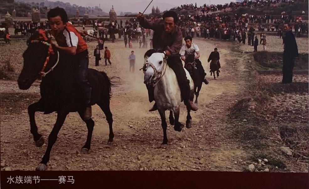 “端午”是都柳江两岸水族的盛大节日,赛马是节日中的喜庆活动,轮流在各村寨举行。比赛开始前,骑手们首先表演腾空跃马的骑技。然后由一位族中德高望重的老人骑着马绕“端坡”(赛马坡)一圈,发令开始。先到达终点的人,可获得精神和物质的奖励。水族赛马是男女老少皆能参与的运动。