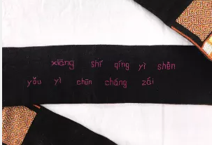 在北京服装学院民族服饰博物馆藏的这条白裤瑶男子盛装腰带的背面,就绣有“相识情义深,友谊春常在”的拼音,也许就是一对白裤瑶青年男女的爱情密码。