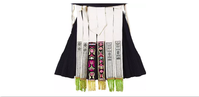 与北方少数民族围腰的简练大气相比,南方少数民族的围腰则更显秀美精细,且常常佩戴前后两块围腰。贵州开阳地区苗族女子的盛装造型,就包含了层叠式前围腰和飘带式后围腰:前围腰分为5层,每层皆以数纱绣为主要装饰工艺,结合绦子边与金属装饰线,并用棉布进行包边处理,围腰面积较大且重量较沉,穿着时系在上衣与坎肩之外,上端两角自然下翻。后围腰以本白色棉布为料,分为6条飘带,装饰部位集中于飘带下方,其中左右两对饰有数纱绣,中间一对则为黑地彩色平绣,飘带底部还缝缀彩色流苏,颇具动感。细致的手工装点出苗家女子之貌美,也彰显着苗家女子之手巧。