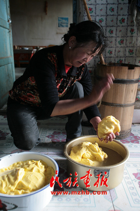 经过反复捣动、分离而制成酥油,并将其保存在牦牛胃制成的口袋里