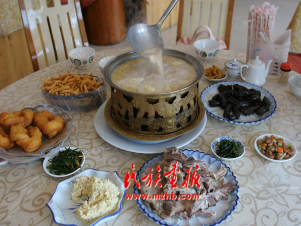 在《蒙古秘史》中有许多蒙古族制作、加工白食的记载。牧民将剩余的奶子加工制作成奶皮、奶豆腐、奶酪等各种便于携带和储存的食品,以满足日常游牧生活和生产的需求。延伸开来,与白食有关的奶茶、奶酒等都可归到白食类。“不喝一顿奶茶,牧民便头疼”是牧民对白食依赖的真实写照。2014年蒙古族奶制品制作技艺入选国家级非物质文化遗产代表性项目。