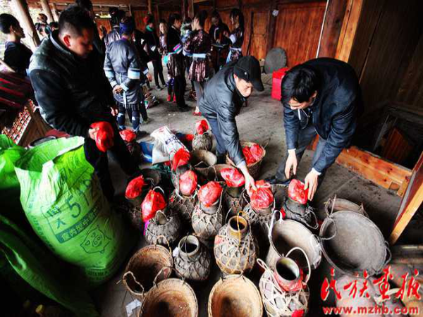 侗族婚俗中还有“买美打油茶”的习俗。“买美”是音译词,是新娘的意思。在举行婚礼的当天,新娘要打油茶,故而有这么一说。另外,新娘在进入夫家的火塘屋前,要通“两关”:跨扁担与穿草鞋。嫁入夫家的第二天还有“挑金水”的习俗。