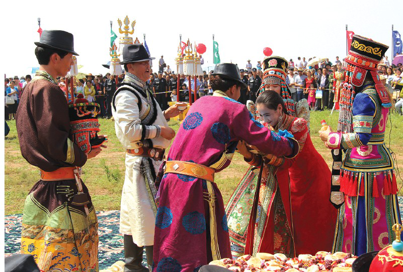 在蒙古民族人生礼仪中,其婚礼仪式最为隆重、热烈,充满草原文化综合特征。蒙古人婚礼习俗经历了从最早的原始群婚、偶婚到后来一夫一妻婚姻制度的发展过程。至13世纪,蒙古人的婚礼习俗已趋完整。《蒙古秘史》载,铁木真九岁时,其父耶速格巴图尔(汉书译作“也速该把秃儿”)带他与翁吉刺惕的德·薛禅之女勃儿帖定亲时就有许多规矩。