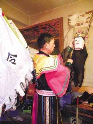 请“脸子”是地戏表演时一个非常讲究的开场仪式。“屯堡地戏”的请脸子仪式通常是整个戏班子的人都必须参加祭拜。表演时必须郑重地从箱子里请出珍藏的“脸子”,“脸子”才具有神的灵性。可是我们看到的大寨布依地戏,在保持传统的同时又不失自己的个性。通常请“脸子”是由当地长老一个人完成所有的祭拜过程,一切都是那么简单。祭拜中都是用当地的布依话娓娓道来,这样的表演给它增添了别有的韵味。