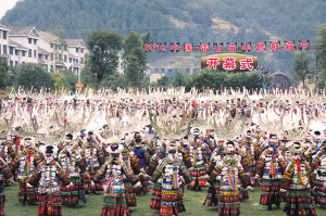 今年适逢雷山县多个村寨过13年一次的鼓藏节,2000余名苗族同胞在开幕式上再现了古老神秘的祭鼓仪式。鼓藏节也是缅怀先人、祭祀祖宗的古老节日,过节期间,家家宰猪祭祖,走亲访友,举行跳芦笙舞、斗牛等民间传统活动。
