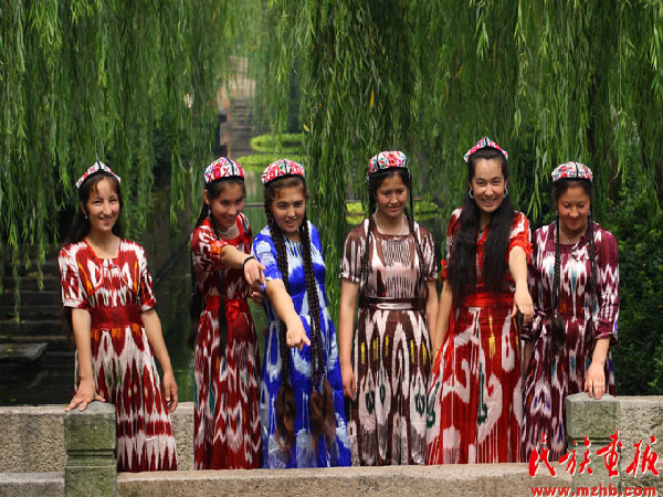 如果说苗族服饰是苗族的一部“无字史书”的话,那新疆维吾尔族的艾德莱斯绸和小花帽则是维吾尔族热情奔放性格的集中体现。艾德莱斯绸质地柔软,轻盈飘逸,非常适合缝制夏装。按颜色分为黑艾德莱斯、红艾德莱斯、黄艾德莱斯和多色艾德莱斯。红艾德莱斯绸图案为红色,底色用黄色或白色,富于青春气息,深受姑娘和少妇的喜爱。黄艾德莱斯绸图案为黄色,在各种底色的衬托下显得庄重而典雅,显示一种富贵气息,一般在制成中青年妇女服装的时候使用。绿艾德莱斯绸多用来缝制学龄前儿童的女装。维吾尔族无论男女老幼,不分春夏秋冬,都喜欢戴一种维吾尔族语称为“朵巴”的小花帽,制作小花帽运用丝线平绣、丝线结绣、串珠片绣、格子架绣、盘金银绣、十字花绣、钩花刺绣、扎绒刺绣以及刺、扎、串、盘等技法,将花卉果实等图案汇集在帽子中,使小花帽的颜色丰富多彩。