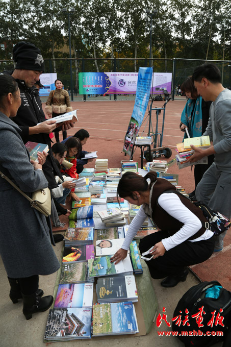 公益售书活动中,读者阅览蒙古文书籍