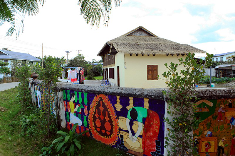 走在喊沙村的林间小道上,金灿灿的傣族奘房(寺庙),雅致的干栏式傣家竹楼,郁郁葱葱的凤尾竹,让人感受到浓郁的南国风情。最令人印象深刻的,还是那一面面色彩斑斓、绚丽夺目的农民画墙。与妹也家的农家乐相隔一条街,住着一位喊沙寨里的傣族农民画家,名叫吞也。傣家农田丰收的喜悦景象、凤尾竹下恋爱的浪漫温情、家庭聚会的和谐温馨、泼水节的纵情狂欢、祭祀祈福的神秘莫测……这些傣族群众生产生活的一幕幕场景,都被这位农民画家搬上画纸、印在墙上。吞也家客厅四周的墙上也挂满了一幅幅色彩艳丽的画,且装裱精致。坐在客厅里,仿佛置身民族风情画展的现场。