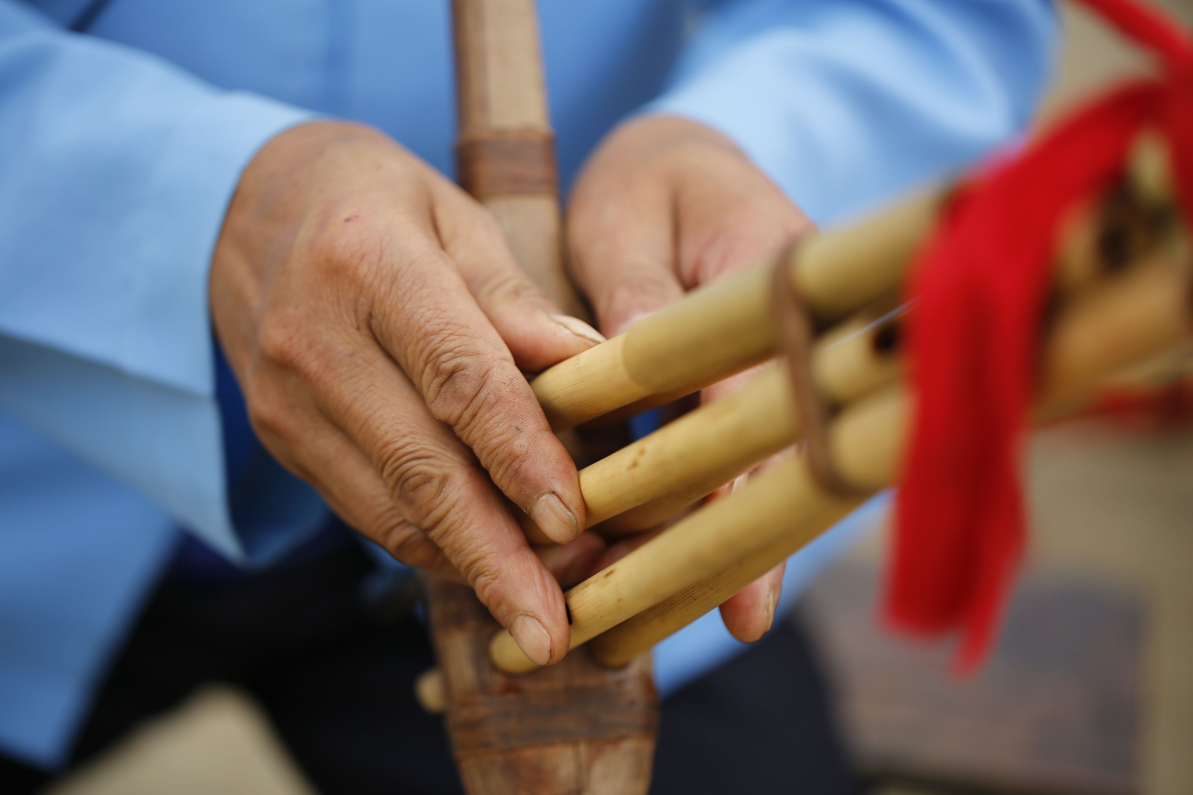 苗族花鼓舞传承人邓开伦教授他人吹奏芦笙1
