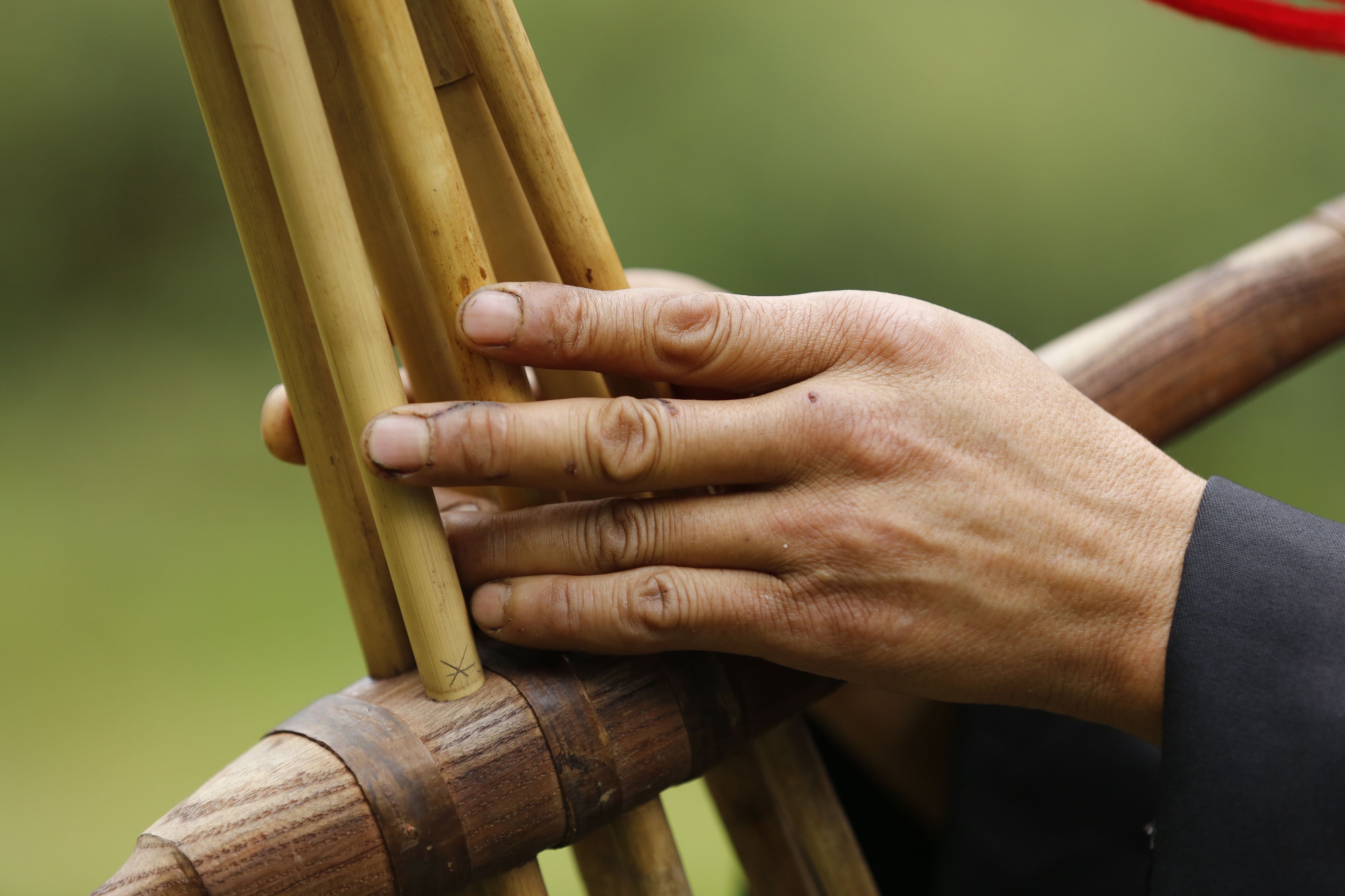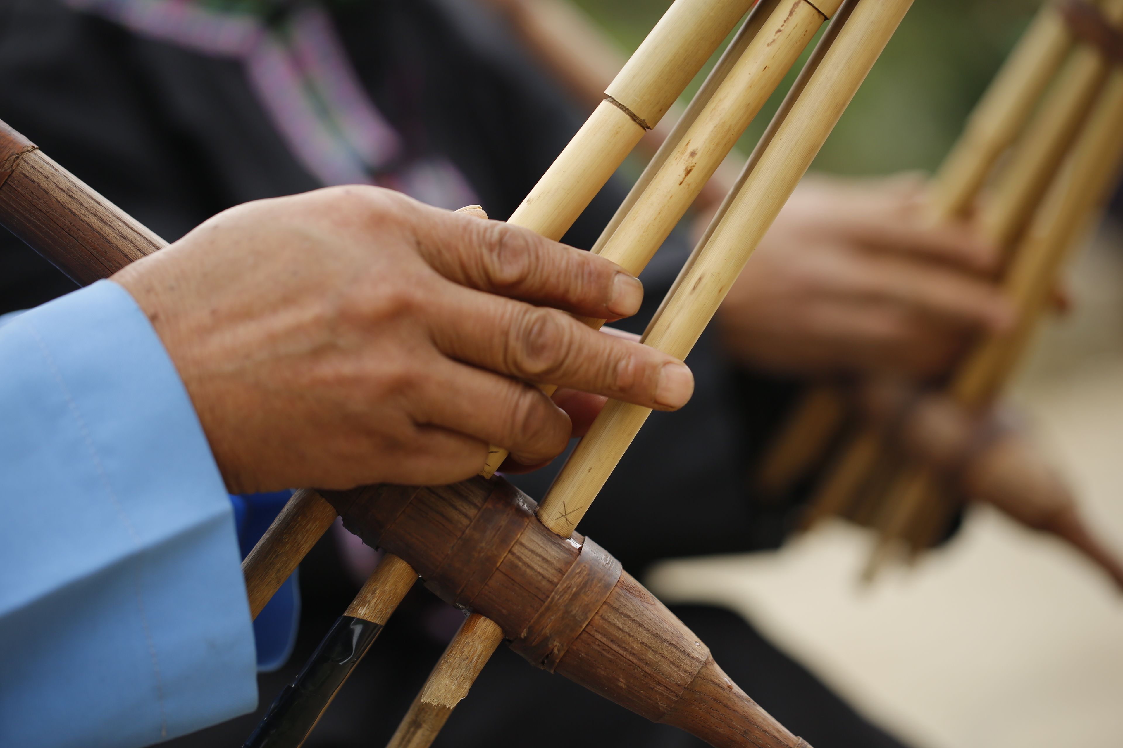 图片名称:贵州贵阳苗族花鼓舞传承人邓开伦教授他人吹奏芦笙