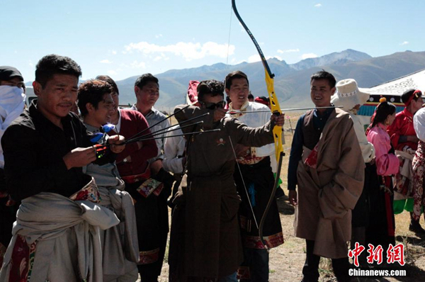 图为青海省玉树藏族自州当地民众进行射箭比赛来庆祝“沐浴节”到来。来源:中新社 摄影:孙睿