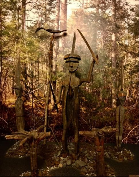 展区内还放置着一组木质神偶,这些神偶来自赫哲族部落。伫立在最中间的神偶起着山神的作用,面目清晰与人等高,手中举着木剑,挖空的腹部能吞掉妖魔鬼怪,一颗硕大的心脏代表强悍的法力,靠墙斜放着一根高高的木杆,顶端栖息着一只鸟(乔卡鸟)。