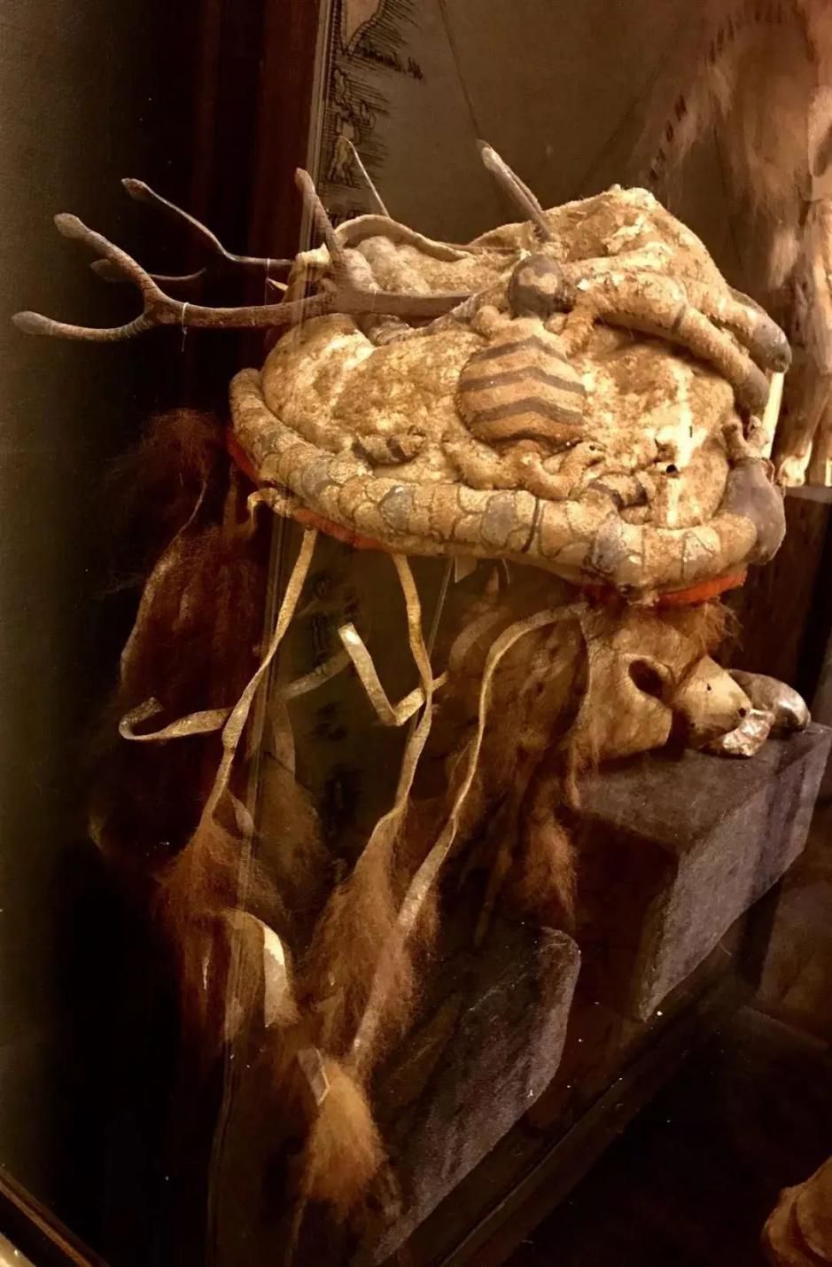 展区内还陈列着几套保存完整的萨满服饰,有鹿皮、兽皮、鱼皮和纤维等多种材料。与国内留存的萨满服饰不同的是其鹿角帽的制作,鹿角帽上装饰着龟、蛇和神偶形象,顶端八岔鹿角的材料是金属。