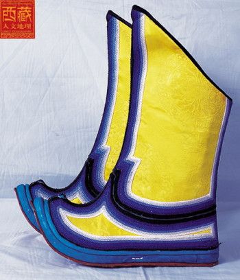 西藏高原地域辽阔,每个地区都有属于自己的鞋子。藏族男女鞋,外观虽然很像舞台上古装戏里穿的靴子,但用牛皮做底,底高二寸,腰高至小腿之上,鞋面用红绿相间的毛呢装饰,鞋腰也有线条、花纹,鞋帮用各色丝线或各色皮革、氆氇、金丝缎制成。人们能从一个人所穿的鞋子判断出一个人的职业和社会阶层。