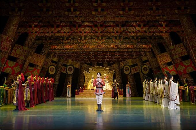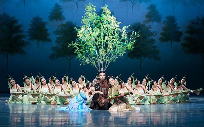 舞剧《传丝公主》以蚕丝为戏剧元素,以蚕桑女宁儿与于阗王子尉迟的爱情为外在线索,以盛唐时中原与西域的交流往来为隐伏线索,将凄美的爱情故事与壮阔的家国情怀交织在一起,引领观众穿越到大唐盛世,感受繁兴的丝路文化和丰富多彩的民族风情。