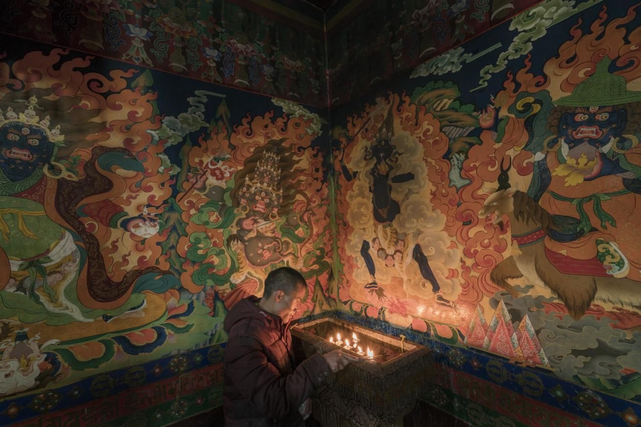 西藏壁画分布在寺庙、府第、宫殿、民宅、驿站、旅店等地方的墙壁上。而寺院则为壁画聚集之所,大寺院往往有数十个到数百个殿堂,各个殿堂及其周围走廊的墙壁、天花板等处均绘满了壁画,如果把这些壁画一幅幅地排列起来,那确实是延绵不断、绚丽多姿、色彩缤纷的美丽画廊。