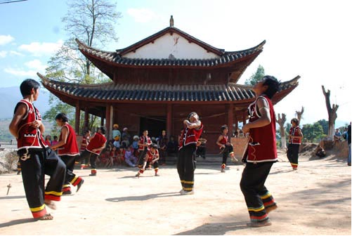 佤族同胞在双江这片红土地上长期繁衍生息,积淀了自己独特的生活和文化习俗。其中最彰显佤族骠勇个性的就是体育竞技“鸡棕陀螺”。鸡棕陀螺迄今只为双江佤族所独有,在全国独一无二。表演鸡棕陀螺极富难度技巧。鸡棕陀螺用质地坚硬的紫杨木制作,因其外观像野生菌鸡棕而得名。其表演要领是: