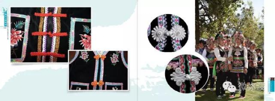“迷撒支”妇女的衣裤,多以青、蓝布料制作。上衣为前襟略短,后襟稍长的大襟右扣式。衽边、衣脚、袖口多镶以单行或双行的带花纹的细辫条,在胸部的衽边常镶有比较自然大方的素色星云图。上衣之上,套加简洁明快的青色无袖小褂。裤子大多为不分前后的大裆宽筒式,脚穿满帮绣花的自制布鞋。在“凸”字形的满胸围腰上绣有精美的叠层花,并以银质梅花链分别从颈部的两侧垂于胸前,最后与围腰头扣相挂,迷撒支妇女服饰彰显简约之美。