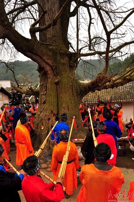 苗族寨老引领众人来到寨中央的千年银杏树下进行祭树,寨老高举牛角、男人们吹起芦笙围着古树转圈,司仪唱起“古歌”祈祷。宁坚摄影,引自民族画报