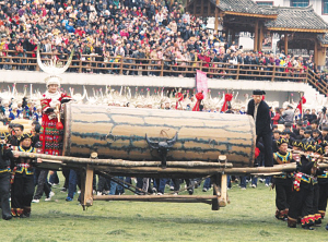 苗族同胞敲起特制的大鼓,庆祝鼓藏节的到来