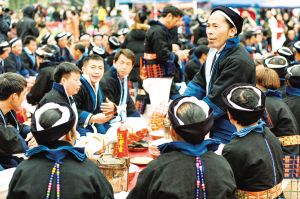 每逢重要节日,白裤瑶群众都有举办长席宴的习俗。以前,芭蕉叶当作盘子,芭芒干折成筷子,一个饭团、一块牛肉,再加一碗酒,就是长席宴的全部。现在改变了很多,但不变的是白裤瑶自然、和谐、平等的美德。2019年2月拍摄。