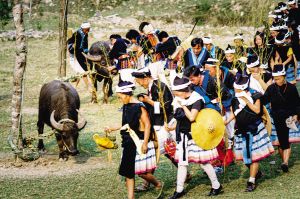 白裤瑶的丧葬习俗十分独特,整个葬礼悲壮、肃穆,气氛凝重庄严。参加葬礼的亲友依次排队顺时针绕牛一圈,缅怀逝去的亲人。2007年10月拍摄。