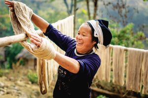 白裤瑶妇女纺纱织布做衣,新买的棉纱要经过蒸煮、漂洗、凉晒才可织布,而年轻一代的白裤瑶妇女大多直接到市场上买白布。2007年10月拍摄。