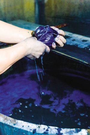蓝靛染布是一项古老的工艺,是白裤瑶服饰文化的重要组成部分。白裤瑶妇女用蓝靛草来提取染布用的靛泥,随时染蓝、青棉线和青布。缝制衣物的白棉布用蓝靛这种天然染料染色,其色泽与一般的机织布印染有所不同。2018年8月拍摄。