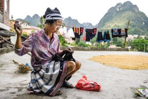 白裤瑶妇女精通纺织印染,至今还保留着一套完整的服饰印染制作技艺。南丹县八圩乡瑶寨村的黎凤珍,自幼跟随祖母和母亲学习白裤瑶服饰的制作技艺。她从小耳濡目染,接触、学习并深深爱上白裤瑶服饰制作技艺。吃苦耐劳的她熟练掌握了30多道复杂的白裤瑶服饰制作工序,还特别擅长刺绣、浸染等技艺。